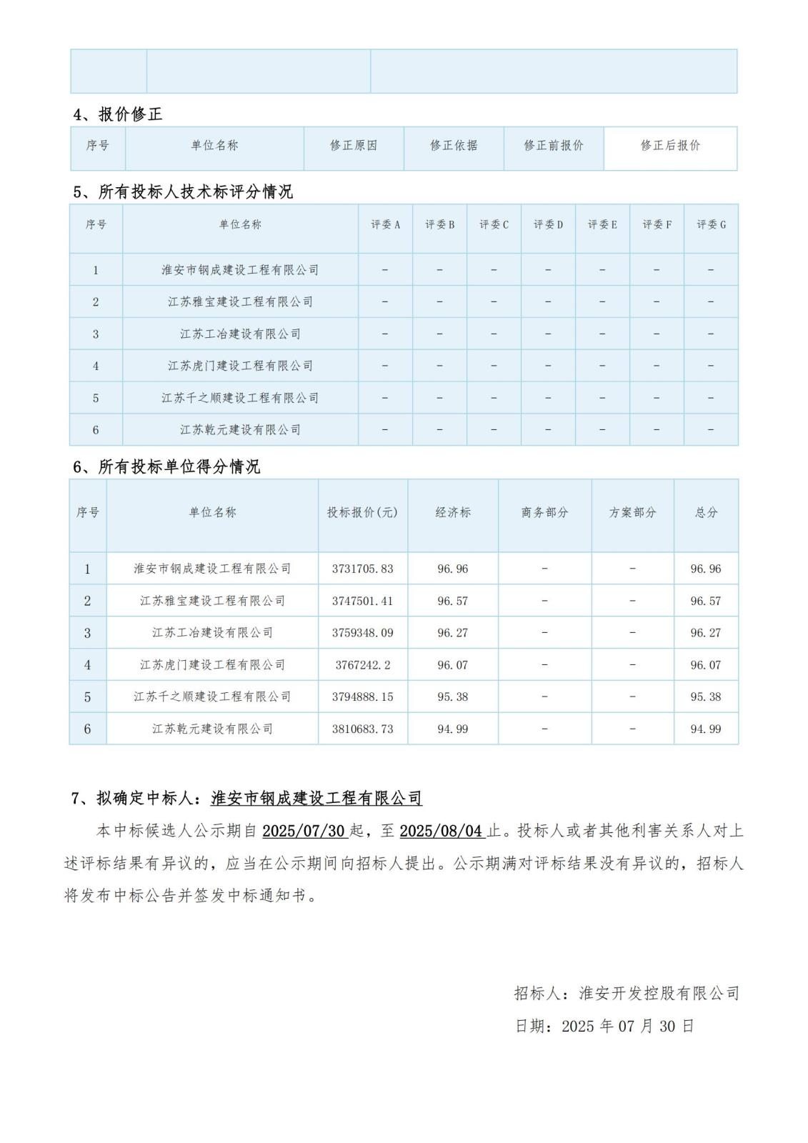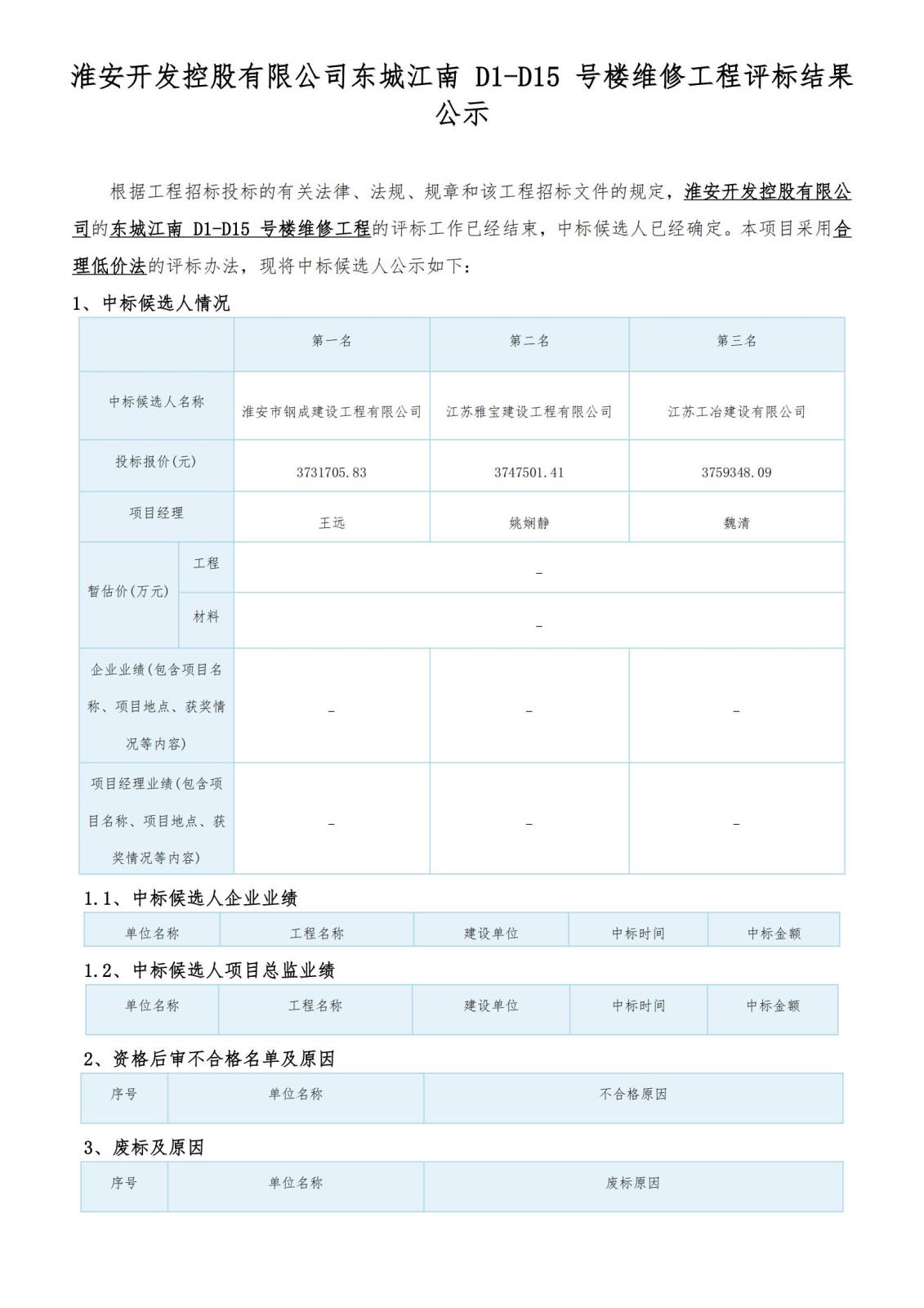 淮安開(kāi)發(fā)控股有限公司東城江南 D1-D15 號樓維修工程評標結果公示