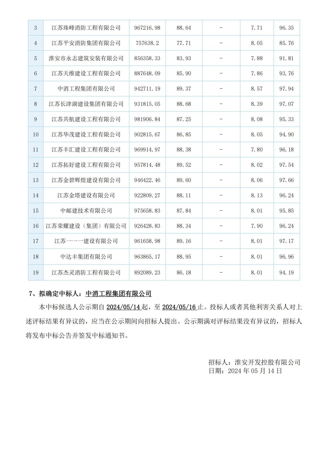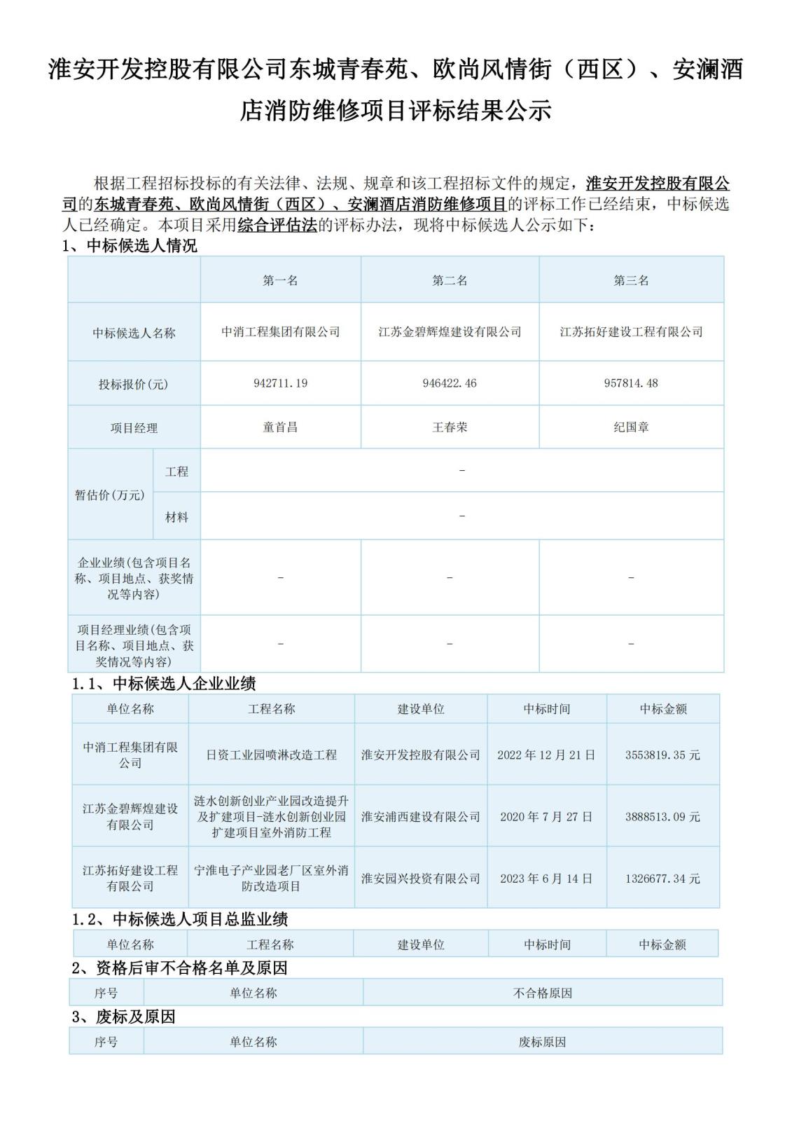 淮安開(kāi)發(fā)控股有限公司東城青春苑、歐尚風(fēng)情街(西區)、安瀾酒店消防維修項目評標結果公示